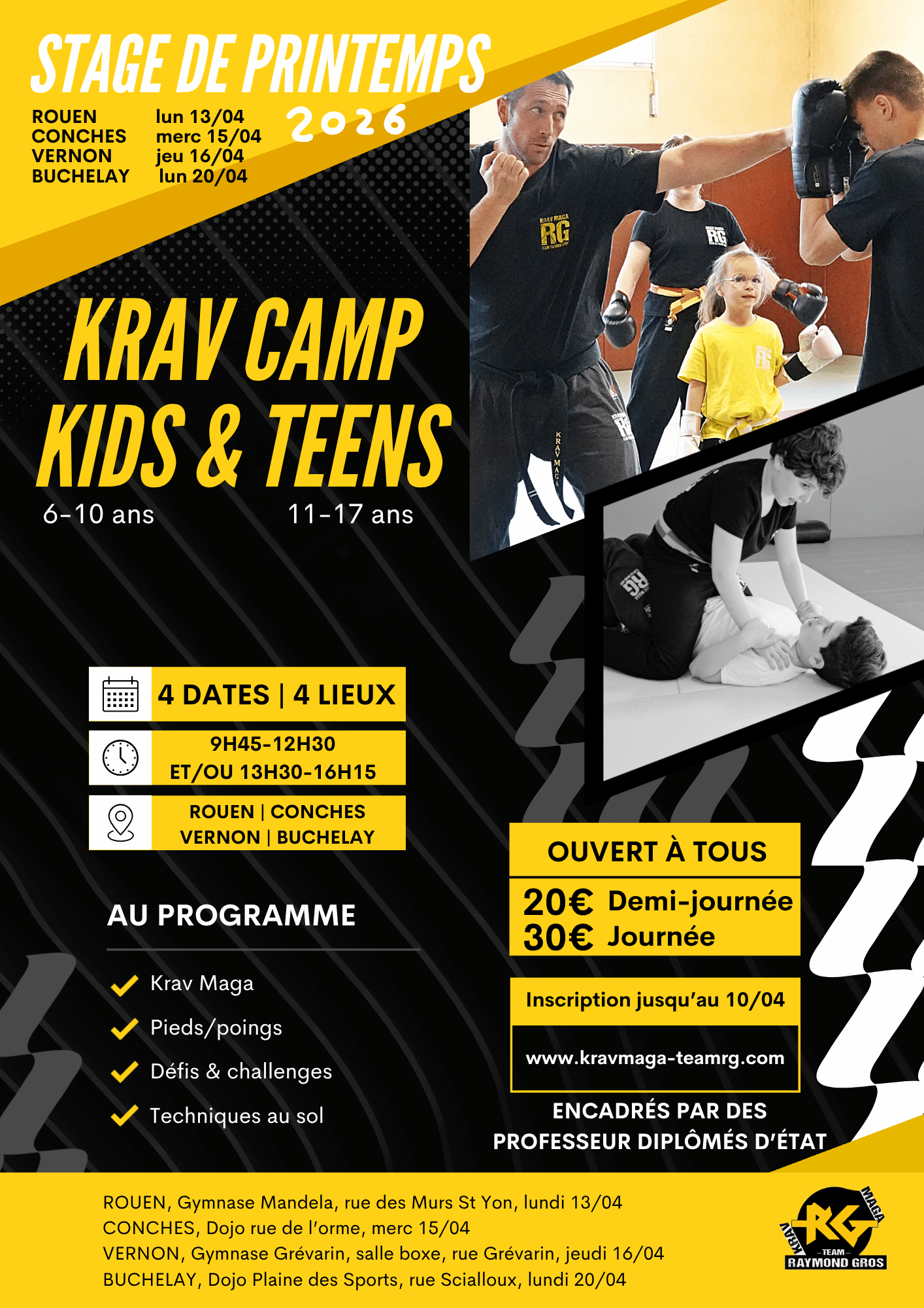 Le Team RG, fort d’une expertise de 35 ans dans l’enseignement de la self-défense et des sports de combat, vous apprend à développer votre mental. Avec des mises en situations « sous stress », des stages à thèmes, ou encore, pour les plus aguerris, des stages intensifs (boot-camp), vous vous surprendrez à relever des défis que vous pensiez inatteignables.