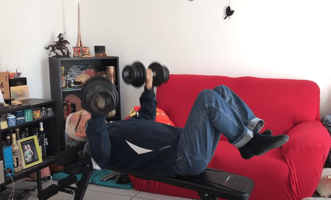 Maître Mochizuki effectue une de ses routines quotidiennes de renforcement musculaire dans son salon en jean sans place spécifique et avec très peu de matériel.