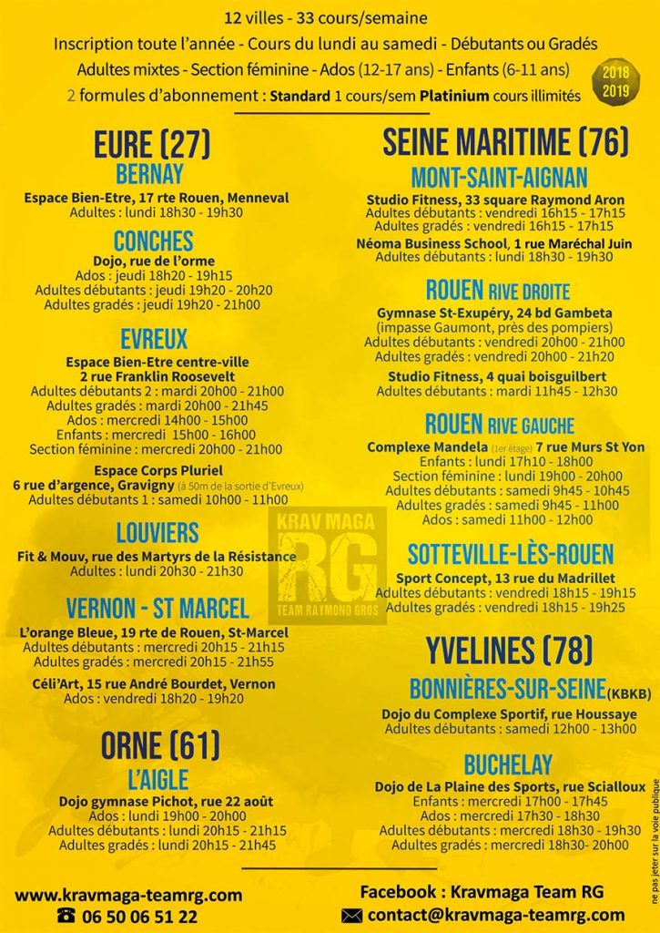 Les cours de Krav Maga pour enfants auront lieu à Buchelay (voir les horaires), Evreux (voir les horaires) et Rouen Rive Gauche (voir les horaires).