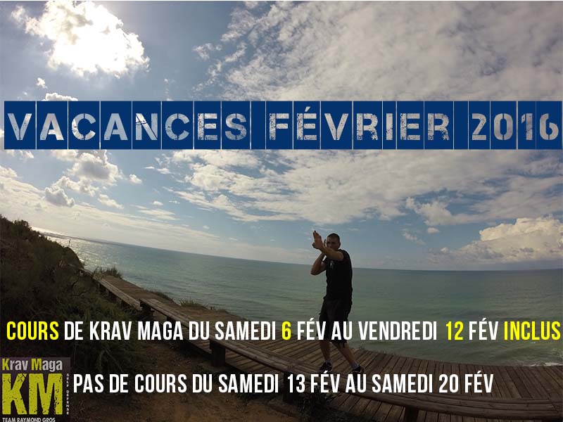 Durant les vacances scolaires de février 2016, les cours de krav maga seront maintenus lors de la 1ère semaine, soit du samedi 6 février au vendredi 12 février inclus.