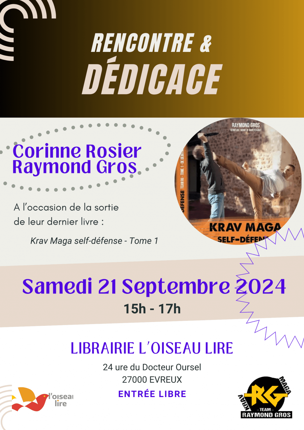 A l’occasion de la sortie de leur livre sur le Krav Maga, Corinne et Raymond feront une séance dédicace le samedi 21 septembre 2024, à la libraire l’Oiseau Lire à…