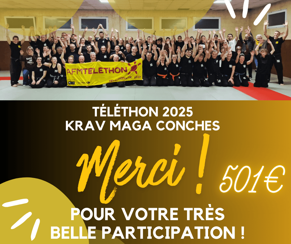 Comme chaque année, l’association Krav Maga Conches a eu l’honneur d’ouvrir le bal du Téléthon, dans la bonne humeur et avec l’énergie qui nous caractérise.