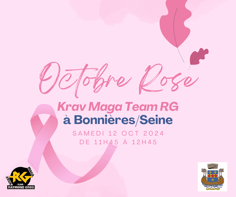 Nous organiserons le samedi 12 octobre dans le dojo du « Complexe sportif La Vallée Française » de 11H45 à 13 H un stage de « krav maga self-défense » ouvert à tous à partir de 18 ans et pour les licenciés de krav maga à partir de 15 ans. La participation des non licenciés du club sera de 5 € au bénéfice de « Octobre Rose » (elle est bien-sûr gratuite pour les licenciés du club). De plus, nous ferons à la fin de ce stage une vente de gâteaux et de boissons au bénéfice total, là aussi, de « Octobre Rose » pour les participants et accompagnants. Chacun peut donc apporter des gâteaux, tartes salées etc. Le club se chargera des boissons. Il n’y a aucune obligation à apporter quoi que ce soit !