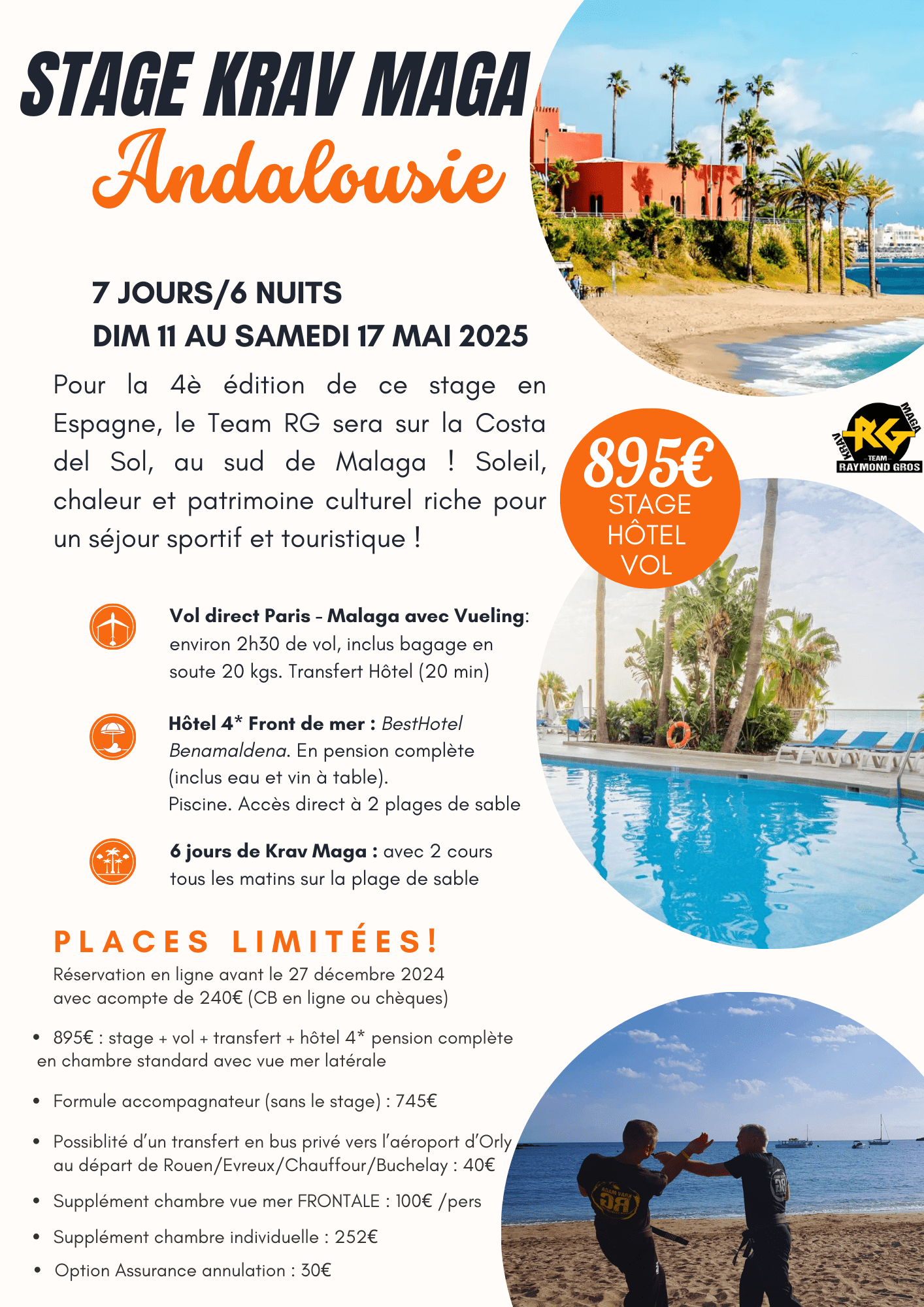 Vol direct Paris Orly / Malaga, opéré par Vueling : départ dim 11 mai à 10h10 et retour le samedi 17 mai à 14h25 (sous réserve de modifications par la compagnie). Ces horaires nous permettront de profiter du dimanche après-midi à la plage, ainsi que le samedi matin pour un dernier entraînement de krav !